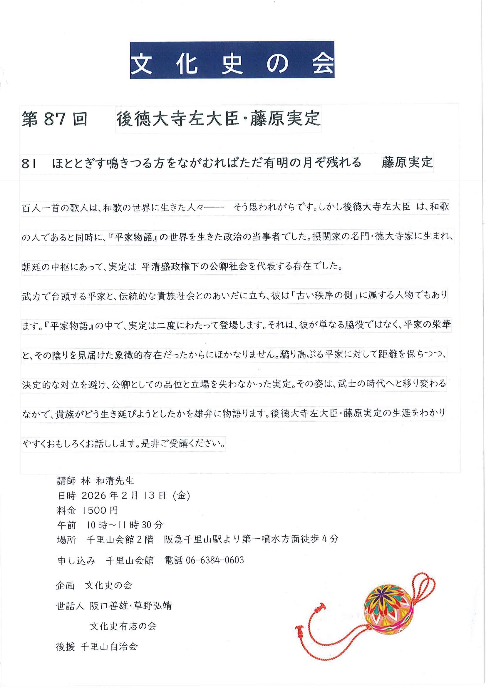 文化史の会 林和清先生 百人一首を読み解く 2019年1月10日講座案内jichikai * 文化史の会では、林和清先生を招き、毎月第二金曜日に千里山会館にて 百人一首を読み解くと題して、百人一首におさめられている百人の歌人たちの歌と生涯を 面白くわかりやすくお話しくださいます。